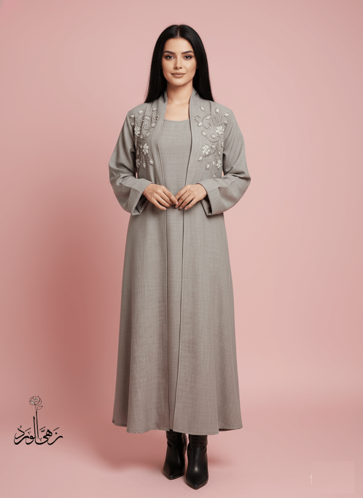 الجلابية مصنوعة من قماش ناعم بخيوط دقيقة تضفي لمسة فخمة، بلون رمادي هادئ يناسب جميع الإطلالات اليومية والمناسبات.